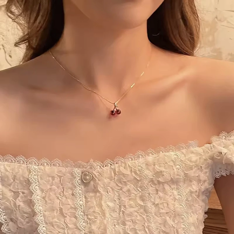 Red Cherry Gold Pendant Necklace & Earrings Set – Stylish Jewelry for Women, Perfect for Weddings & Birthdays