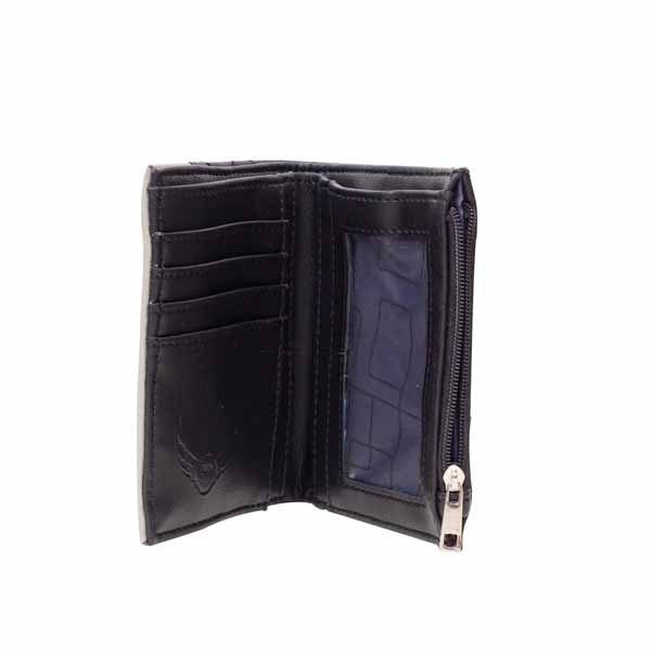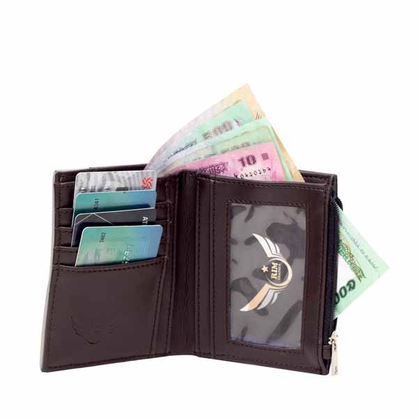 Inside Details: 1 compartment for cash, 4 pockets for credit cards, 1 ID window, 1 zipped coin pocket.
