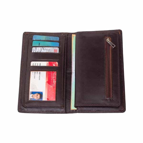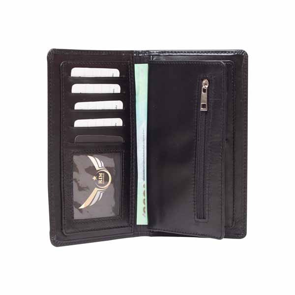 Interior details: 14 pockets for credit cards, 1 ID window, 2 large compartments for cash, 3 additional pockets for receipts, 1 zipped coin pocket.