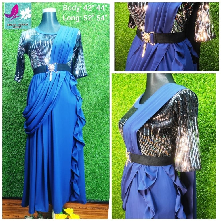 Shari Gown - 1200 taka Color - 4 (Yellow, Merin, Blue, Misti or Bangy) Body - 42, 44 Long - 54 Fabric: Georgette and Patti net with inside inner. Half ba three-quarter hanta. Belt free.