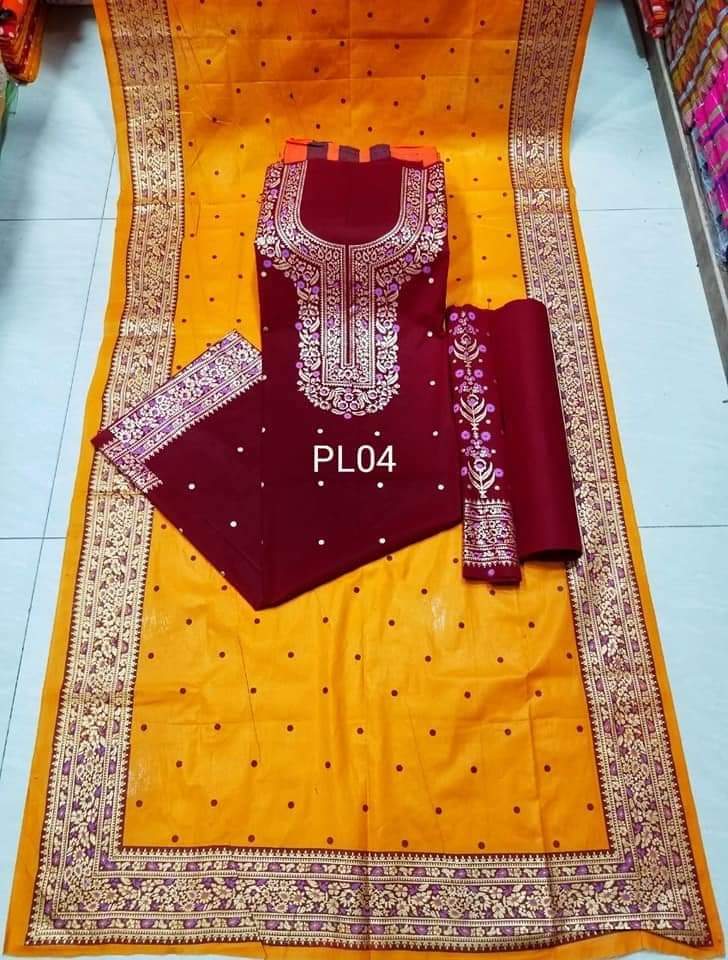 কাশ্মীরি কারচুপি স্কিন প্রিন্ট 3পিস বডী হাতা ৩গজ সেলওার ২.৫ গজ ওরনা ৫হাত রাজধানি ভয়েল