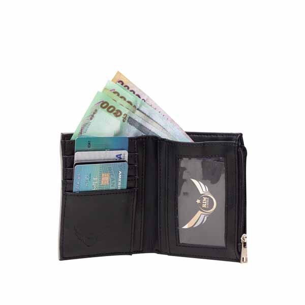 Inside Details: 1 compartment for cash, 4 pockets for credit cards, 1 ID window, 1 zipped coin pocket.