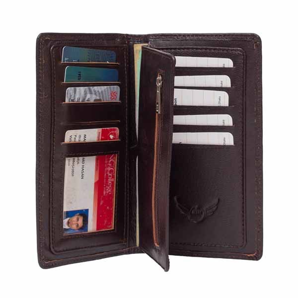 Interior details: 14 pockets for credit cards, 1 ID window, 2 large compartments for cash, 3 additional pockets for receipts, 1 zipped coin pocket.