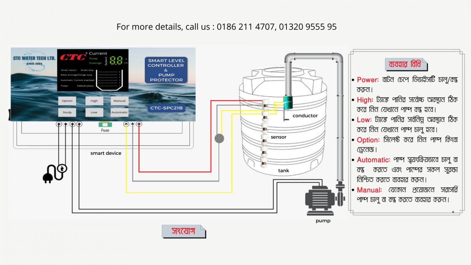 ট্যাঙ্কের পানি কমে গেলে এবং পানি পূর্ণ হলে পাম্প স্বয়ংক্রিয়ভাবে চালু ও বন্ধ হবে।